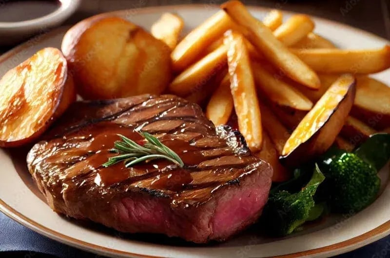 Texture Revelation: Soft, diffused natural light casts gentle shadows that accentuate the steak’s texture—those charred grill lines or the glistening surface become more pronounced, inviting the viewer to feel the steak’s tenderness.